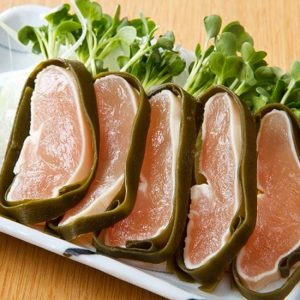 ビタミンEが豊富でクセがなく柔らかい桜姫の胸肉をボイル・急冷し、柚子の皮と一緒に肉厚の昆布で巻くことで水分が抜け、まるでお刺身のような食感と昆布の上品なうま味で絶品に!おすすめは、だし茶漬け。魚とは一味違うプリッとした美味しさが楽しめます。
